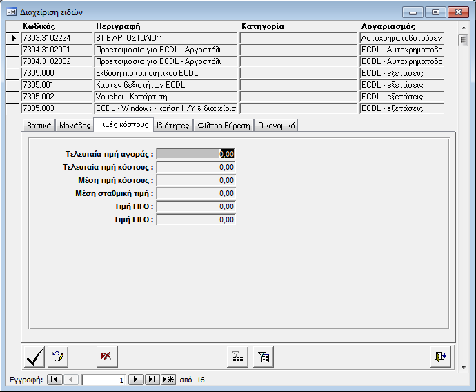 Στη σελίδα «Τιμές Κόστους» εμφανίζονται οι τιμές κόστους του είδους όπως έχουν διαμορφωθεί μέχρι αυτή την στιγμή.