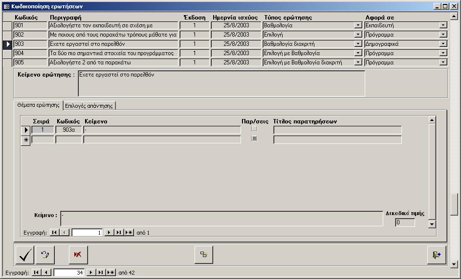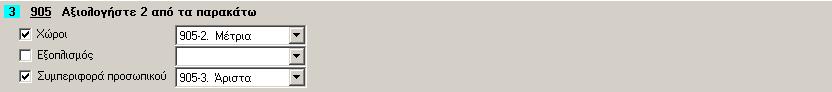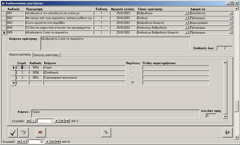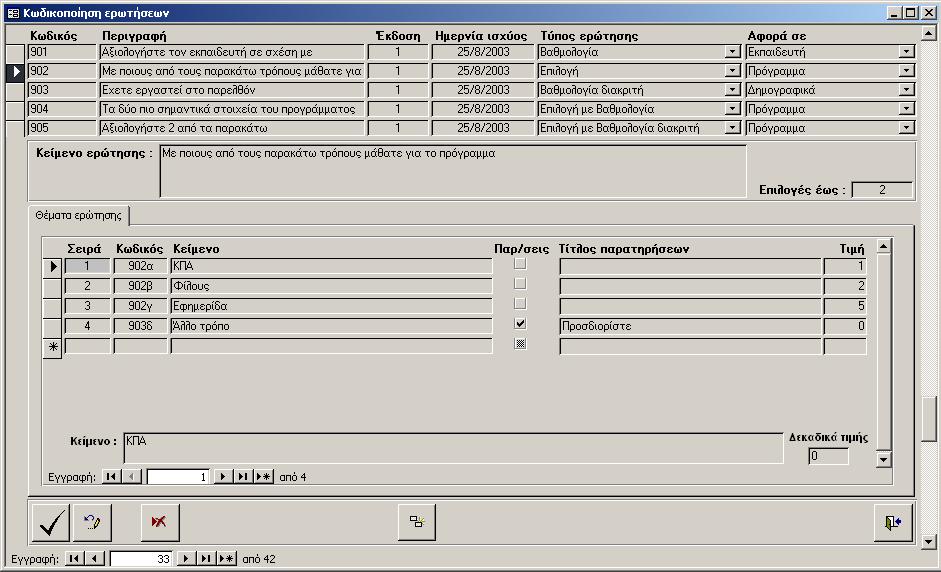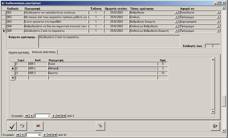 Στις ερωτήσεις που απαντώνται με βαθμολογία διακριτή πρέπει να συμπληρωθούν οι δυνατές επιλογές που μπορεί να κάνει ο απαντών (βλ. σχήμα α3). Τα στοιχεία που πρέπει να συμπληρωθούν για κάθε επιλογή είναι τα ακόλουθα: