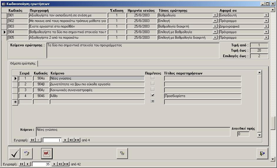 Υπάρχει η δυνατότητα μία ερώτηση να αλλάξει στο μέλλον αλλά να έχει το ίδιο περιεχόμενο στην ουσία. Για παράδειγμα μία ερώτηση «Πόσο καλά γνωρίζετε το Word 2000» στο μέλλον μπορεί να γίνει «Πόσο καλά γνωρίζετε το Word XP». Στην ουσία πρόκειται για την ίδια ερώτηση με διαφορετική περιγραφή και όχι για άλλη ερώτηση αφού αναφέρεται στο Word και στις δύο περιπτώσεις. Σε μία τέτοια περίπτωση δεν καταχωρούμε νέα ερώτηση αλλά την ίδια ερώτηση με τον ίδιο κωδικό και άλλη έκδοση και ημερομηνία ισχύος. Με τον τρόπο αυτό μπορούμε να αναφερόμαστε στην ερώτηση, κάνοντας στατιστική στις απαντήσεις των ερωτηματολογίων. Για την πρώτη έκδοση καταχωρούμε τον αριθμό 1, για την δεύτερη το 2 κ.ο.κ.