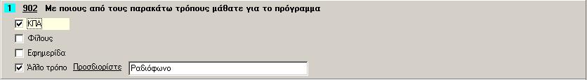 - Επιλογή: Ο απαντών την ερώτηση καλείται να επιλέξει μία η περισσότερες από κάποιες συγκεκριμένες επιλογές (π.χ. «Με ποιους από τους παρακάτω τρόπους μάθατε για το πρόγραμμα: α) από το ΚΠΑ, β) από φίλους, γ) από δημοσίευση»).
