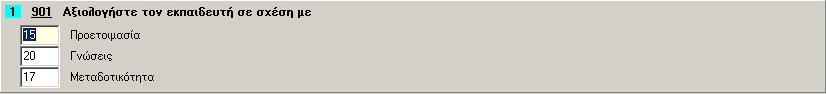 Στο συγκεκριμένο παράδειγμα βαθμολογείται ο εκπαιδευτής από 1 έως 20 για τρία διαφορετικά θέματα. Ο βαθμός της ερώτησης είναι η αριθμητική τιμή που έδωσε ο απαντών.