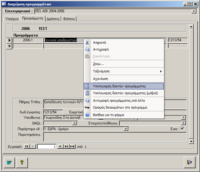 Στην διαδρομή προγράμματα-διαχείριση προγραμμάτων επιλέγουμε το πρόγραμμα για το οποίο θέλουμε να υπολογίσουμε τους δείκτες και με δεξί κλικ ξεκινάμε την διαδικασία του υπολογισμού. Προϋπόθεση αποτελεί ο ορισμός των δεικτών – βλέπε αντίστοιχη ενότητα ανωτέρω- και η ένταξη τους στην ομάδα δεικτών που θα χρησιμοποιηθούν στο επιχειρησιακό.