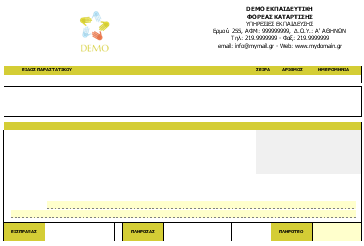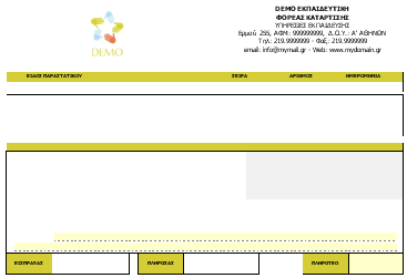 Demo-InvoiceLaserDet Πρότυπο για τιμολόγια Μέγεθος Α4 Περιέχει τα στοιχεία του συναλλασσόμενου, αναλυτικά τα τιμολογημένα είδη, καθώς επίσης και την ανάλυση συνόλων για ξεχωριστές υποκείμενες αξίες με ξεχωριστό ΦΠΑ (ποσό και ποσοστό), αξία επιβαρύνσεων. |