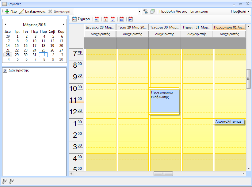 Στην προβολή ημερολογίου, μπορείτε να δείτε τις εργασίες επάνω σε ημερολόγιο, σε διάφορες μορφές (ημερήσια, εβδομαδιαία 5/7, μηναία και χρονοδιαγράμματος)