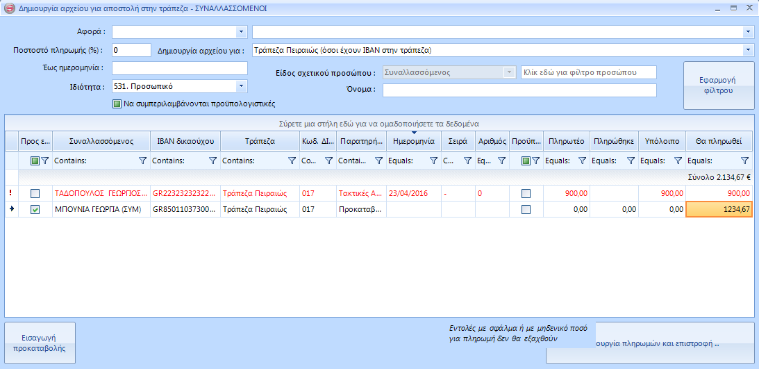 Εδώ μπορείτε να επιλέξετε τους συναλλασσόμενους βάσει ιδιότητας, για τους οποίους θέλετε να εισάγετε προκαταβολή.