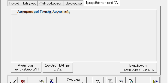 Έστω ότι μόλις πατήσατε το πλήκτρο ΕΛΠ, πριν καταχωρήσετε το λογιστικό σχέδιο ΕΛΠ. Θα έχετε μια άδεια λίστα. Μπορείτε επιλέγοντας την σελίδα "Τροφοδότηση από ΓΛ" να χρησιμοποιήσετε την λειτουργία ανάπτυξη λογιστικού σχεδίου ΕΛΠ.