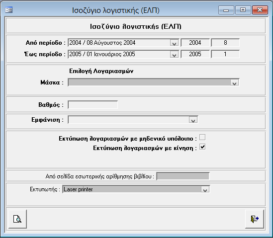 - Εκτύπωση λογαριασμών με κίνηση (θα εκτυπωθούν μόνο οι λογαριασμοί που έχουν κινηθεί στα όρια των Περιόδων)