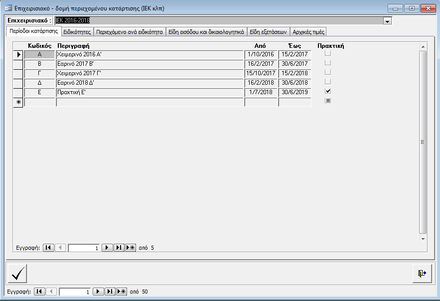 Στις περιόδους κατάρτισης, εισάγετε τον κωδικό περιόδου, την περιγραφή και τις ημερομηνίες έναρξης και λήξης κάθε περιόδου.