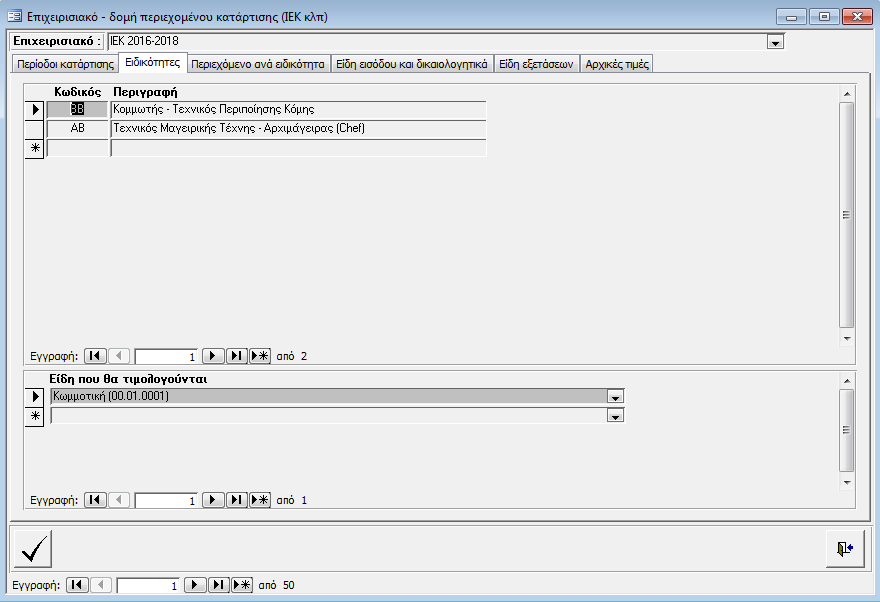 Στην καρτέλα ειδικότητες, εισάγετε τις τον κωδικό και περιγραφή κάθε ειδικότητας που θα συμμετάσχει στο συγκεκριμένο επιχειρησιακό και θα δημιουργήσετε για αυτή μαθήματα.