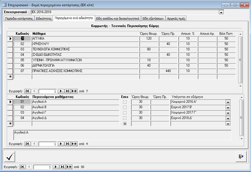 Εδώ μπορείτε να καταχωρήσετε μια δομημένη μορφή ενός περιεχομένου κατάρτισης (για ΙΕΚ, κτλ), με ειδικότητες, μαθήματα και περιεχόμενο μαθημάτων, έτσι ώστε για τα προγράμματα και υποέργα του συγκεκριμένου επιχειρησιακού, να δημιουργείτε αυτόματα το περιεχόμενο κατάρτισης.