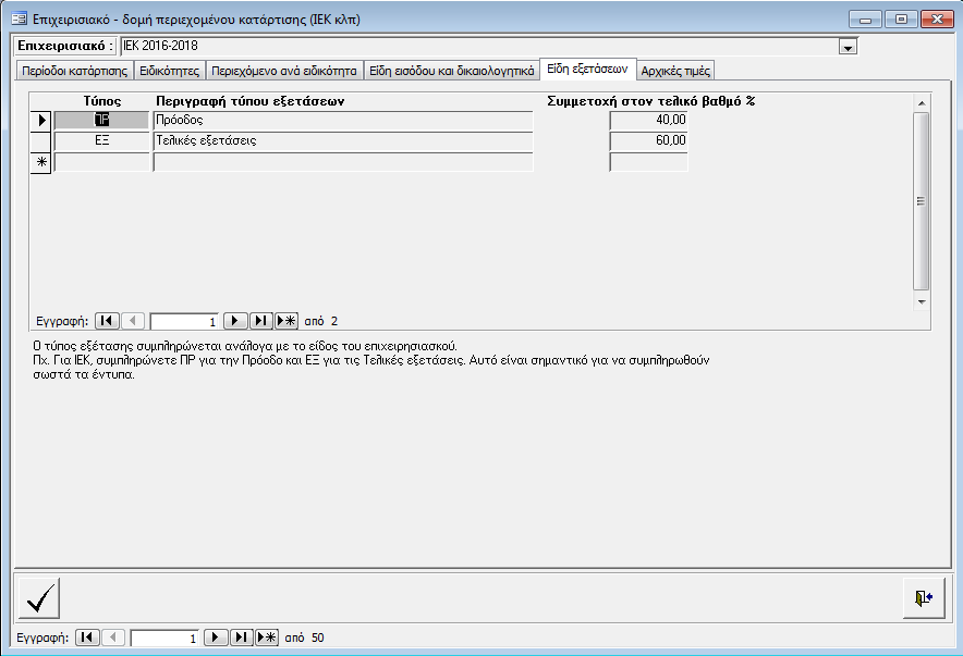 Στα είδη εξετάσεων, εισάγετε τους τύπους των εξετάσεων για τα μαθήματα στα οποία οι καταρτιζόμενοι θα εξεταστούν και θα πιστοποιηθούν.