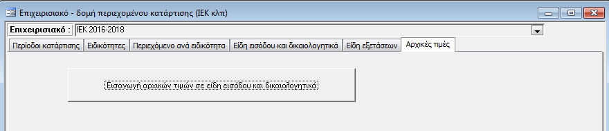 Σημείωση: Μπορείτε να μεταβείτε στην καρτέλα Αρχικές Τιμές και να κάνετε κλικ στο κουμπί "Εισαγωγή Αρχικών Τιμών σε είδη εισόδου και δικαιολογητικά" έτσι ώστε να ενημερώσετε αυτόματα τον πίνακα με τα πρότυπα δικαιολογητικά εγγραφής σπουδαστή σε ΙΕΚ.