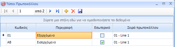 Στην φόρμα διαχείρισης των τύπων πρωτοκόλλου, εισάγετε τους τύπους που θέλετε να χρησιμοποιήσετε και να έχετε διαθέσιμους κατά την λήψη πρωτοκόλλων και τους συνδέετε με την αντίστοιχα σειρά.