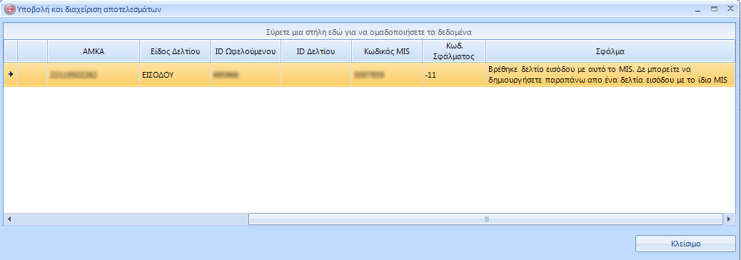 Μετά το τέλος της διαδικασίας, θα ανοίξει ένα παράθυρο με τα αποτελέσματα της αποστολής. Τα δελτία τα οποία απεστάλησαν επιτυχώς, θα έχουν κωδικό σφάλματος 0 και στις παρατηρήσεις θα αναγράφει την επιτυχή καταχώρηση, καθώς επίσης και το ID ωφελούμενου και ID δελτίου που έχει δημιουργήσει το σύστημα ΟΠΣ. Σε περίπτωση σφάλματος (όπως στην παρακάτω εικόνα), θα ενημερώνεστε για το σφάλμα που προέκυψε έτσι ώστε να προβείτε στις απαραίτητες ενέργειες.
