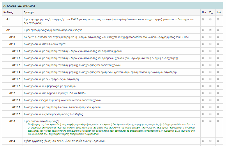 Στην καρτέλα Δεδομένα εισόδου-εξόδου, κάνοντας κλικ στα κουμπιά "Ενημέρωση Εισόδου" ή "Ενημέρωση Εξόδου", δημιουργούνται αντίστοιχα ερωτηματολόγια προς απάντηση, για κάθε έναν καταρτιζόμενο, βάσει του προ-επιλεγμένου προτύπου στο επιχειρησιακό.