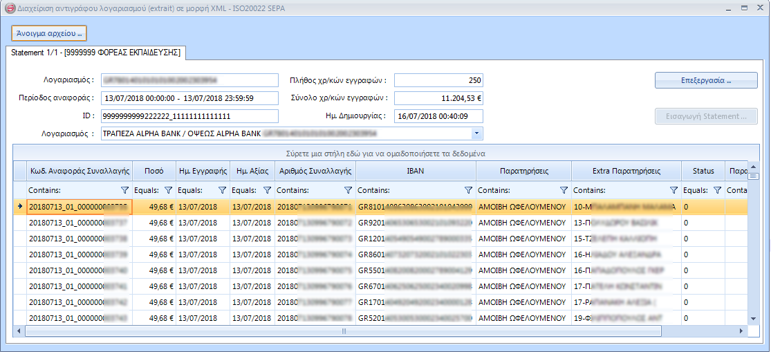 2. Εάν το ηλεκτρονικό αρχείο xml περιέχει περισσότερα από ένα statements, τότε θα δημιουργηθούν αντίστοιχα τόσες καρτέλες διαχείρισης στην παραπάνω οθόνη, όσες και τα statements αυτά. Την διαδικασία επεξεργασίας και εισαγωγής θα την εκτελέσετε σε κάθε καρτέλα/statement.