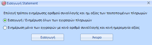- Ενημέρωση μόνο των εγγραφών με κενό αριθμό συναλλαγής και κενή ημερομηνία αξίας: Θα ενημερώσει των αριθμό συναλλαγής και την ημερομηνία αξίας, όλων των ταυτοποιημένων εγγραφών για τις οποίες και ο αριθμός συναλλαγής αλλά και η ημερομηνία αξίας είναι κενά.