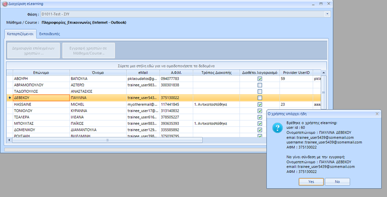 Προστέθηκε ένας επιπλέον έλεγχος κατά την διαδικασία δημιουργίας λογαριασμού στο συνδεδεμένο πάροχο τηλεκατάρτισης. Έτσι, κατά την δημιουργία του χρήστη, περνάει και το ΑΦΜ του ως πληροφορία. Στη συνέχεια, εάν αυτός ο χρήστης βρεθεί με βάση το email, βγαίνει μήνυμα στον χειριστή με τα στοιχεία που είναι καταχωρημένα στο σύστημα τηλεκατάρτισης αλλά και του προς δημιουργία μαθητή, ζητώντας από τον χειριστή να επιβεβαιώσει την σύνδεση.