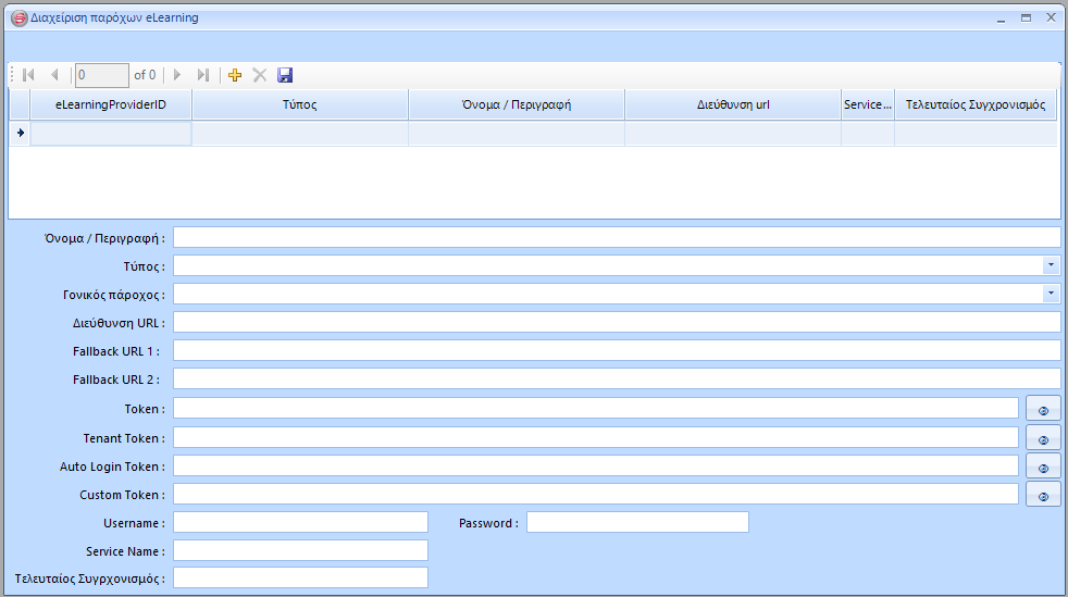 Στην διαχείριση παρόχων eLearing, ορίζετε τους παρόχους τηλεκατάρτισης (σύγχρονης και ασύγχρονης) που θα χρησιμοποιηθούν στα προγράμματα κατάρτισης.