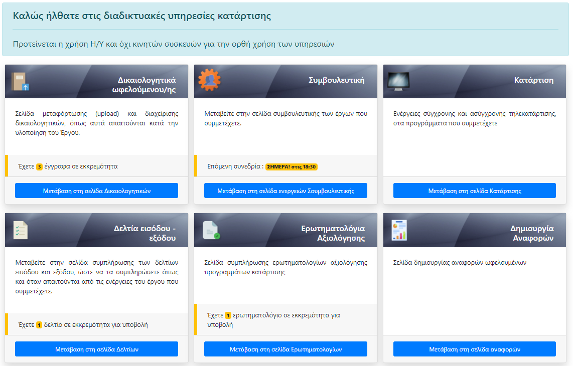 Οι συνδεδεμένοι χρήστες, ανάλογα με την ιδιότητα που έχουν (καταρτιζόμενοι, εκπαιδευτές, ελεγκτές, χρήστες) έχουν μια επισκόπηση όλων των ενεργειών που μπορούν να κάνουν (σε καρτέλες) και να μεταβούν στις αντίστοιχες υπηρεσίες (τηλεκατάρτιση, αξιολόγηση, δεδομένα εισόδου, αναφορές). Στην επισκόπηση των ενεργειών εμφανίζονται και πληροφορίες όπως έγγραφα σε εκκρεμότητα, επόμενες συνεδρίες, ερωτηματολόγια σε εκκρεμότητα, κτλ). Το ποιες ενέργειες θα εμφανίζονται στην σελίδα επισκόπησης, ελέγχεται μέσω των παραμέτρων (Παράμετροι Web) στο SharpCRM. |