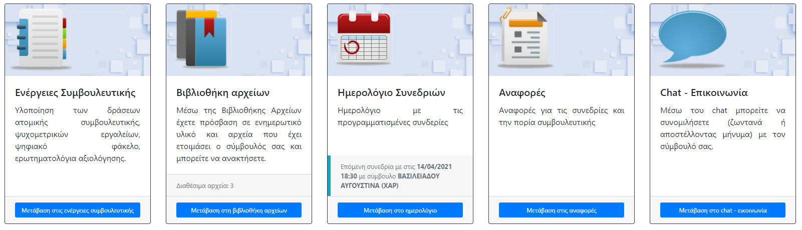 Ολοκλήρωση της συμβουλευτικής Argus. Παράλληλα με την διαχείριση δομής και περιεχομένου συμβουλευτικής στο ArgusERP, παρέχεται η δυνατότητα διαχείρισης όλων των ενεργειών συμβουλευτικής μέσω ArgusWEB, ώστε οι ωφελούμενοι και σύμβουλοι και ελεγκτές να έχουν πρόσβαση μέσω διαδικτύου σε αυτές τις υπηρεσίες. Παρέχονται δυνατότητες προγραμματισμού συνεδριών, μεταφόρτωσης αρχείων και διαμοιρασμός υλικού έργου, σύνδεση με ψυχομετρικά τεστ, δημιουργία αναφορών, επικοινωνία με γραπτό μήνυμα σε πραγματικό χρόνο (chat), ημερολόγιο, ψηφιακό φάκελο, κ.α. |