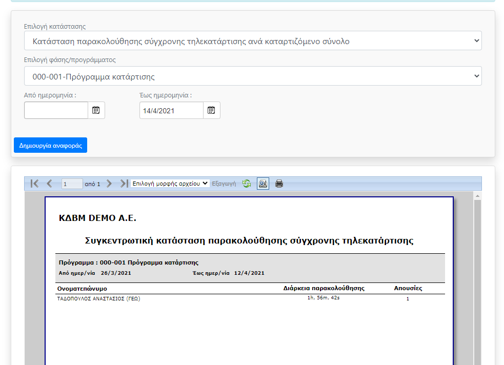 Προστέθηκε η δυνατότητα νέου τρόπου δημιουργίας αναφορών για όλους τους χρήστες (καταρτιζόμενους, εκπαιδευτές, ελεγκτές, χρήστες, κτλ) Οι αναφορές διαθέτουν φίλτρο (όπου χρειάζεται) και παράγονται στην οθόνη. Ο χρήστης μπορεί να τις εκτυπώσει ή να τις αποθηκεύσει σε διάφορες μορφές αρχείων.