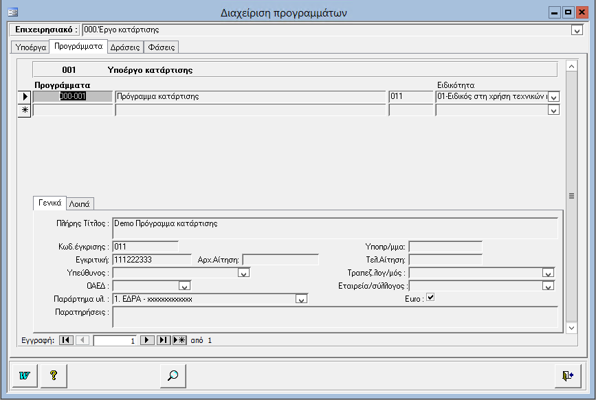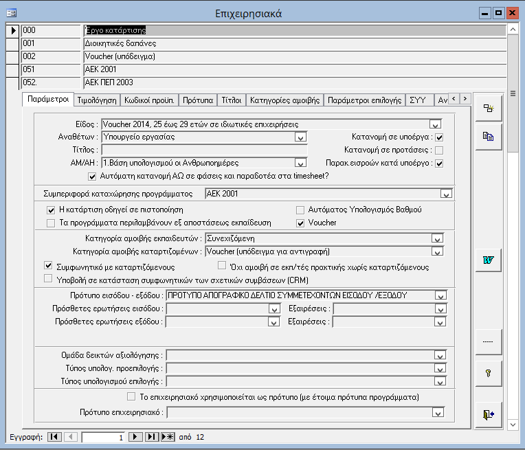 Από την διαχείριση επιχειρησιακών, ανοίγετε (ή δημιουργείτε με αντιγραφή) ένα νέο επιχειρησιακό, το οποίο θα χρησιμοποιηθεί για την καταχώρηση των υποέργων και προγραμμάτων. Σε αυτό το επιχειρησιακό θα πρέπει να ορίσετε τις παραμέτρους που προβλέπονται (είδος, πρότυπα, τίτλοι, κατηγορίες αμοιβής.