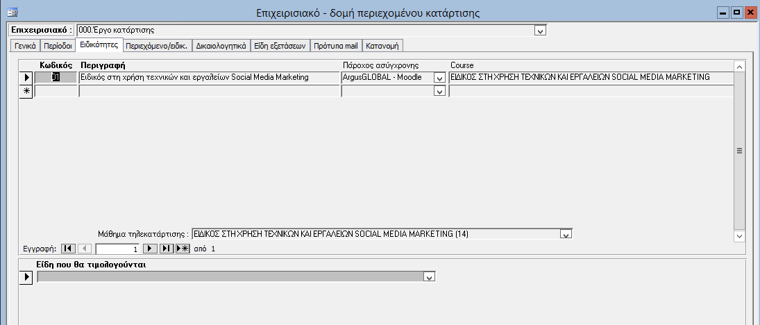 Στην φόρμα διαχείρισης δομής περιεχομένου κατάρτισης, εισάγετε τις ειδικότητες που θα χρησιμοποιήσετε στα προγράμματα κατάρτισης. Εάν πρόκειται για περιεχόμενο που αφορά σε ασύγχρονη τηλεκατάρτιση και έχετε κάνει την παραμετροποίηση που απαιτείται, τότε συνδέεται τις ειδικότητες με τα αντίστοιχα μαθήματα (courses) του παρόχου ασύγχρονης τηλεκατάρτισης.