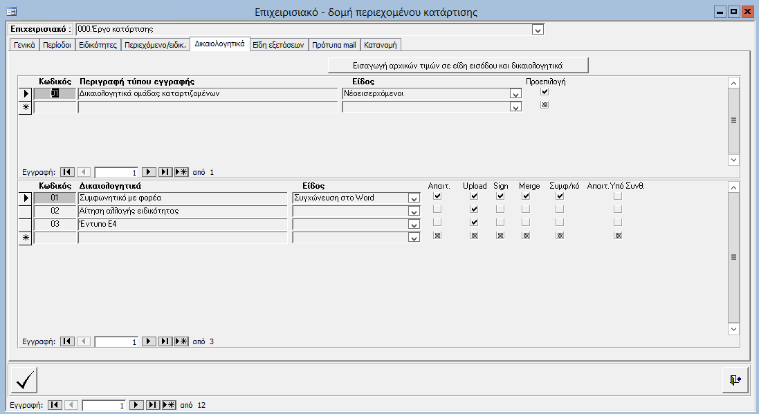 Εάν οι ωφελούμενοι , κατά την έναρξη της κατάρτισης, θα πρέπει να προσκομίσουν κάποια δικαιολογητικά, ή να υπογράψουν συμφωνητικά, τότε ορίζετε τα δικαιολογητικά αυτά στην αντίστοιχη φόρμα.
