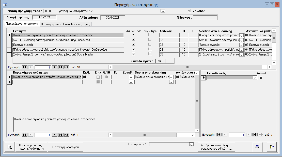 Σε κάθε πρόγραμμα, εισάγετε το περιεχόμενο κατάρτισης. Αυτό γίνεται αυτόματα εφόσον έχετε συνδέσει τις ειδικότητες με το περιεχόμενό τους.