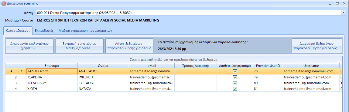 Εφόσον θα πραγματοποιηθεί ασύγχρονη τηλεκατάρτιση και έχετε κάνει την απαραίτητη παραμετροποίηση του παρόχου ασύγχρονης τηλεκατάρτισης, δημιουργείτε αυτόματα τους χρήστες στον πάροχο και τους εγγράφετε στο course που θα παρακολουθήσουν. Ομοίως, εάν τα προγράμματα περιέχουν 'Συμβουλευτική', η οποία είναι συνδεδεμένη με πάροχο συμβουλευτικής, σε αυτό το βήμα δημιουργείτε χρήστες στο συνδεδεμένο πάροχο. (Στην εσωτερική συμβουλευτική του ArgusERP, δεν χρειάζεται αυτό).