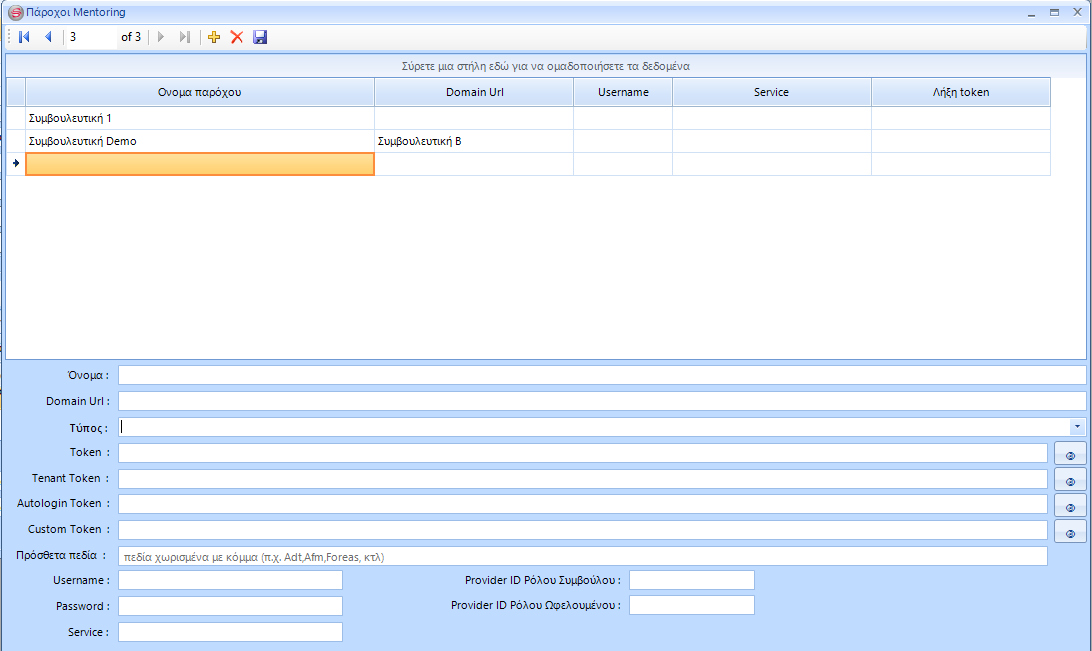 Στην διαχείριση παρόχων mentoring-συμβουλευτικής, ορίζετε τους παρόχους συμβουελτικής που θα χρησιμοποιηθούν στα προγράμματα κατάρτισης.