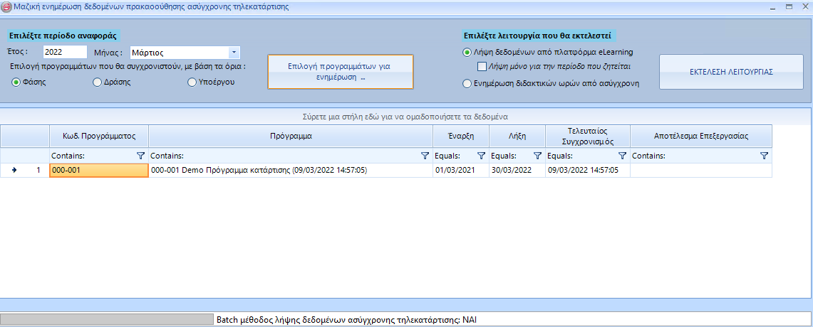 Επιλέγουμε Έτος και Μήνα και πατάμε Επιλογή προγραμμάτων για ενημέρωση για να εμφανιστούν τα προγράμματα που έχουν δεδομένα ασύγχρονης την περίοδο αυτή. Επιλέγουμε τη λειτουργία Λήψη δεδομένων από πλατφόρμα eLearning και πατάμε το κουμπί ΕΚΤΕΛΕΣΗ ΛΕΙΤΟΥΡΓΙΑΣ για να γίνει η λήψη των δεδομένων. Τέλος, επιλέγουμε τη λειτουργία Ενημέρωση διδακτικών ωρών από ασύγχρονη και πατάμε ΕΚΤΕΛΕΣΗ ΛΕΙΤΟΥΡΓΙΑΣ για να μετατραπούν οι ώρες παρακολούθησης σε διδακτικές ώρες.
