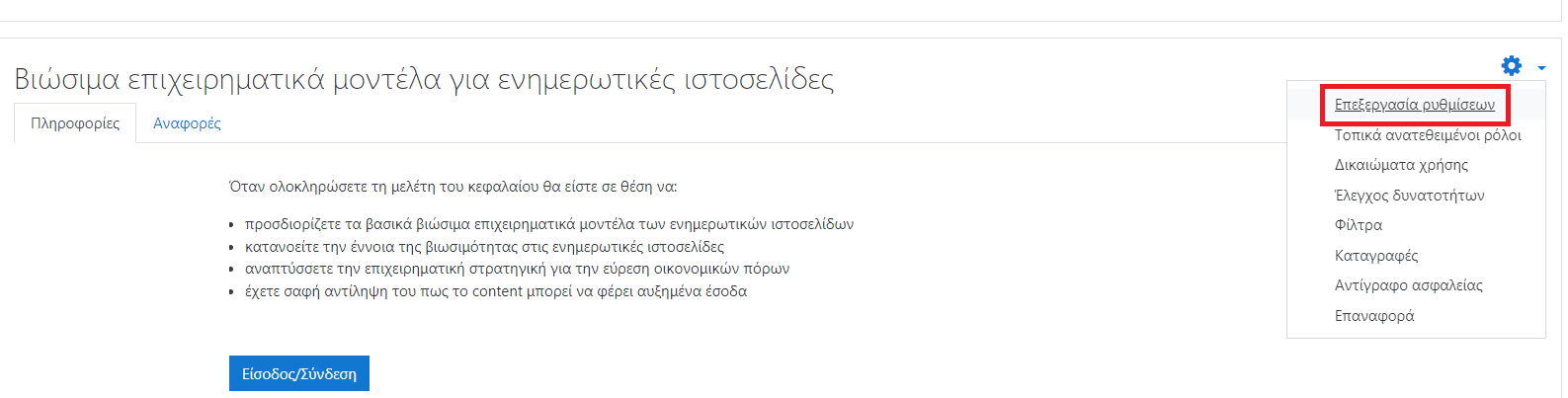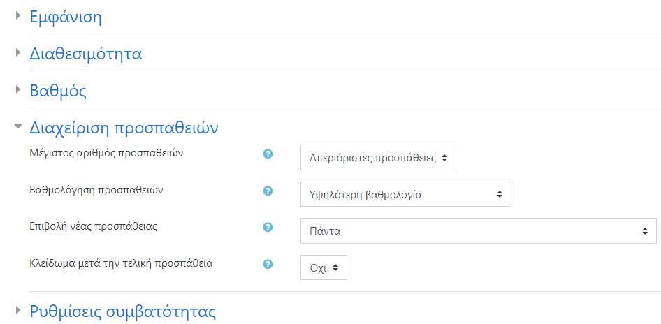 Βήμα 1: Στην πλατφόρμα του Moodle, θα πρέπει στις ρυθμίσεις κάθε Scorm κάθε μαθήματος (εικ.1) να ορίσουμε στην Διαχείριση προσπαθειών την παράμετρο Επιβολή νέας προσπάθειας ως Πάντα (εικ.2).