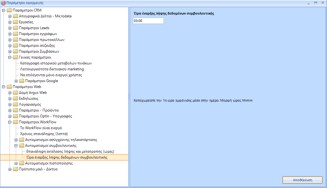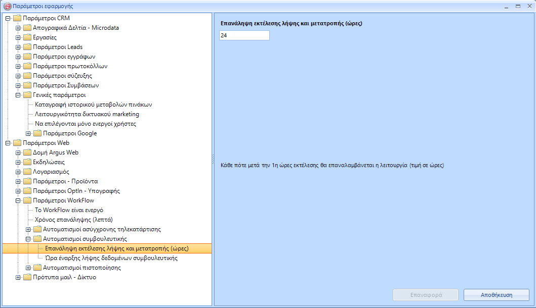 Στο [Παράμετροι WorkFlow] \ [Αυτοματισμοί Συμβουλευτικής] \ [Επανάληψη εκτέλεσης λήψης και μετατροπής (ώρες)], επιλέγουμε ανά πόσες ώρες θέλουμε να γίνεται η επανάληψη της παραπάνω λειτουργίας και πατάμε Αποθήκευση.