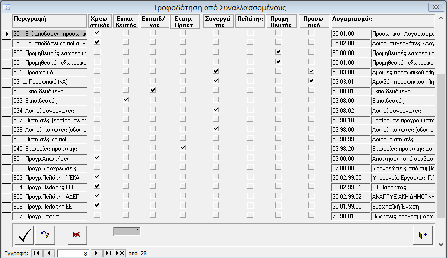 Όπως θα δούμε στο κεφάλαιο «Συναλλασσόμενοι», σε κάθε συναλλασσόμενο έχω την δυνατότητα να προσδώσω μία ή περισσότερες ιδιότητες, ανάλογα με το τι συναλλαγές έχει με την εταιρεία.