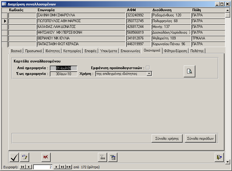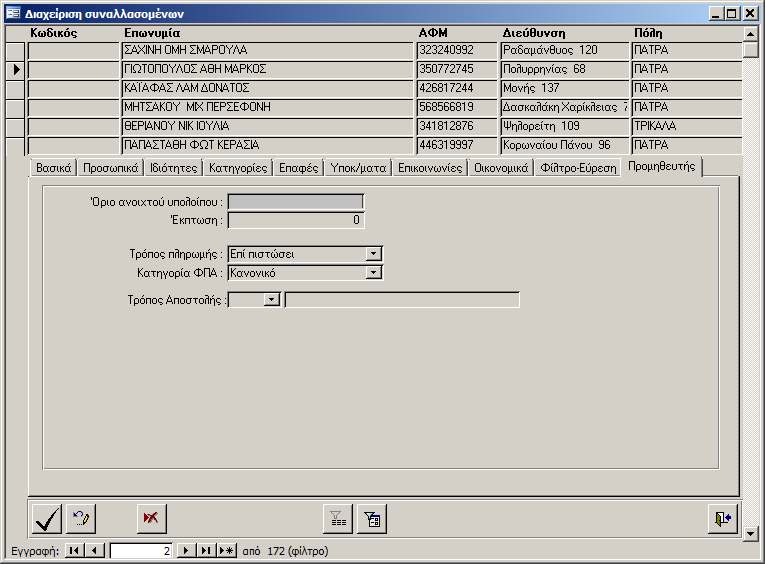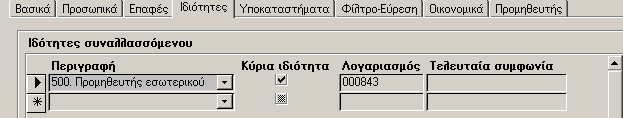 Για τις ιδιότητες που είναι χαρακτηρισμένες ως Πελάτης ή Προμηθευτής εμφανίζεται μία επιπλέον σελίδα στην οποία συμπληρώνονται στοιχεία που αφορούν την συναλλαγή που έχει ο συναλλασσόμενος με την εταιρεία ως πελάτης η προμηθευτής.