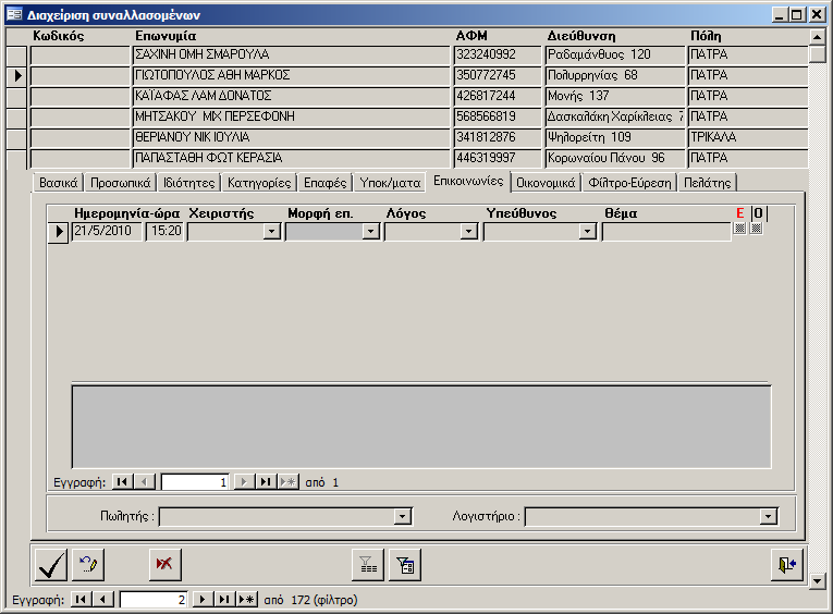 Στην σελίδα «Επικοινωνίες» καταχωρούμε τις επικοινωνίες που πραγαμτοποιήσαμε με τον συναλλασσόμενο