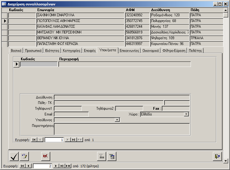 Στην σελίδα «Υποκαταστήματα» καταχωρούμε, εάν υπάρχουν, τα υποκαταστήματα ενός συναλλασομένου ( κυρίως εταιρίες ) και τα πρόσωπα επικοινωνίας σε αυτά.