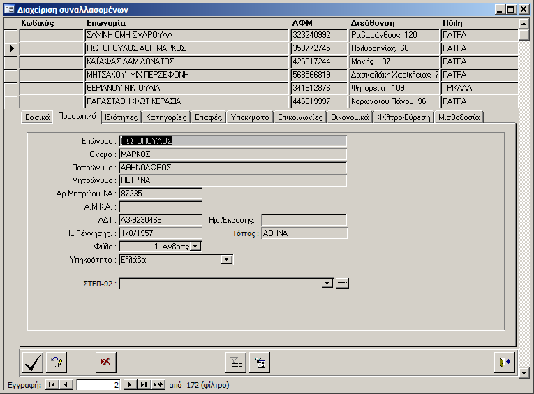 «Βασικά» - «Προσωπικά» - «Ιδιότητες» - «Επαφές» - «Υποκαταστήματα» - «Επικοινωνίες» - «Οικονομικά» - «Φίλτρο-Εύρεση» - «Μισθοδοσία»