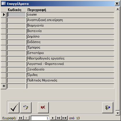 Στο αρχείο «Επαγγέλματα» καταχωρούνται οι επαγγελματικές δραστηριότητες των συναλλασσομένων όπως φαίνεται στην εικόνα που ακολουθεί.